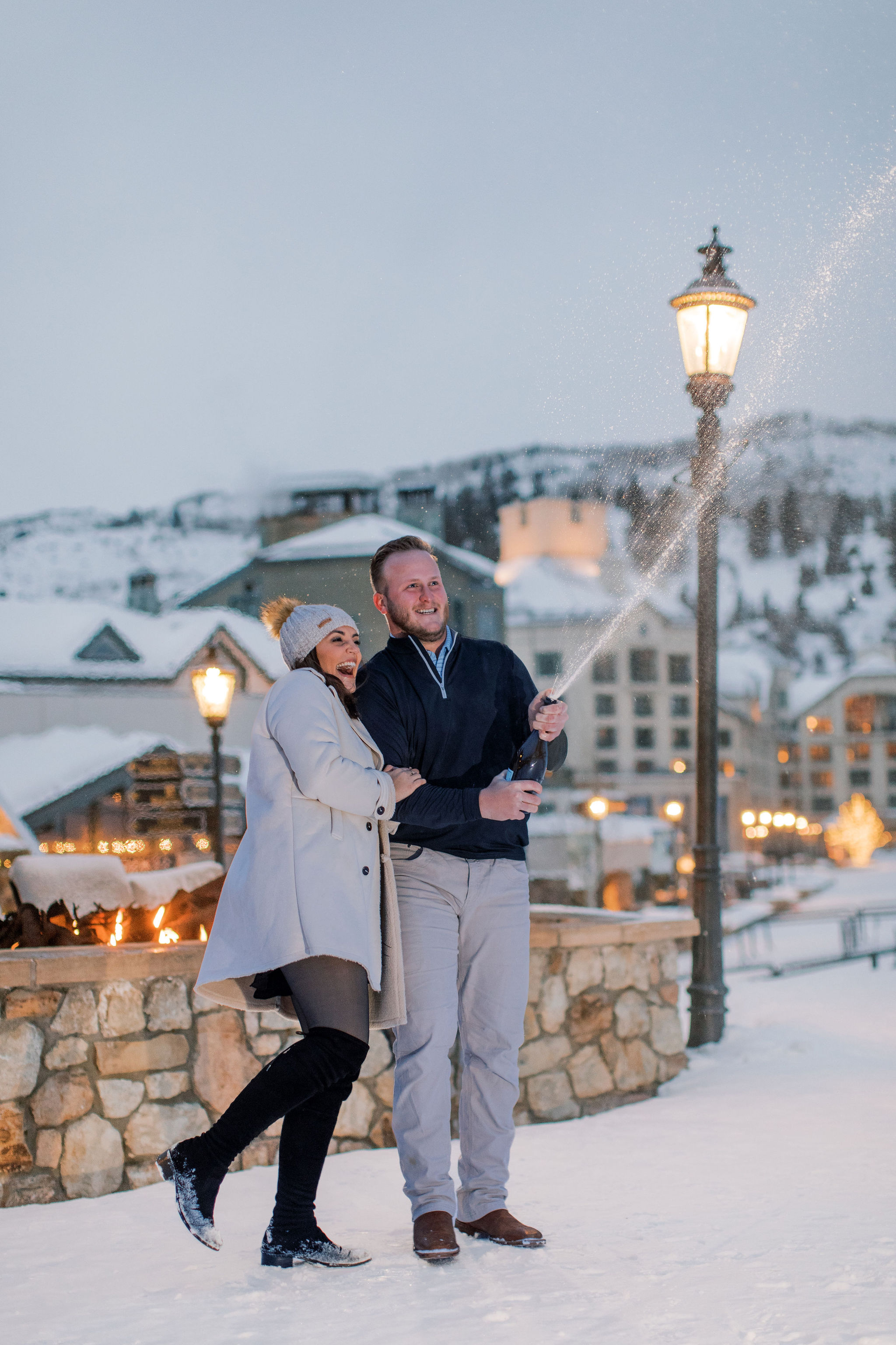 Hadley’s whole family toasted to the newly engaged couple at the Beaver Creek Chophouse before boarding the snowcat-pulled sleigh ride to dinner. Once we went to the cabin, they both had a lot more adrenaline and excitement to allow me to capture some fun after dark photos of them outside the restaurant with snow falling and inside, cozied up in front of their great stone fireplace.